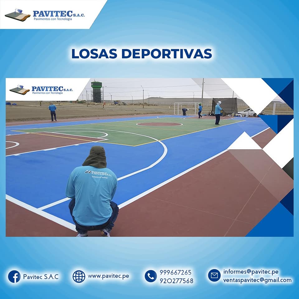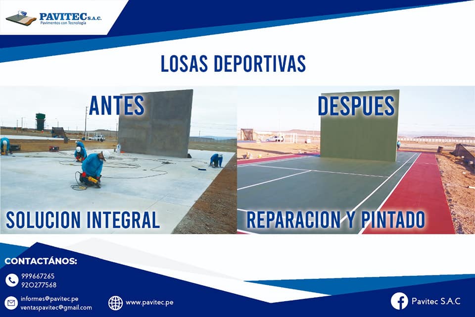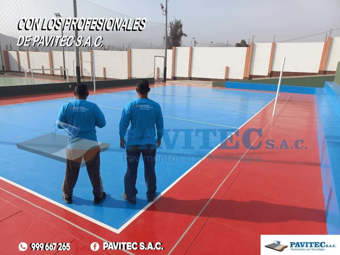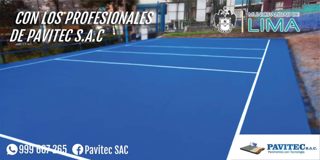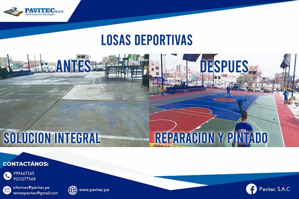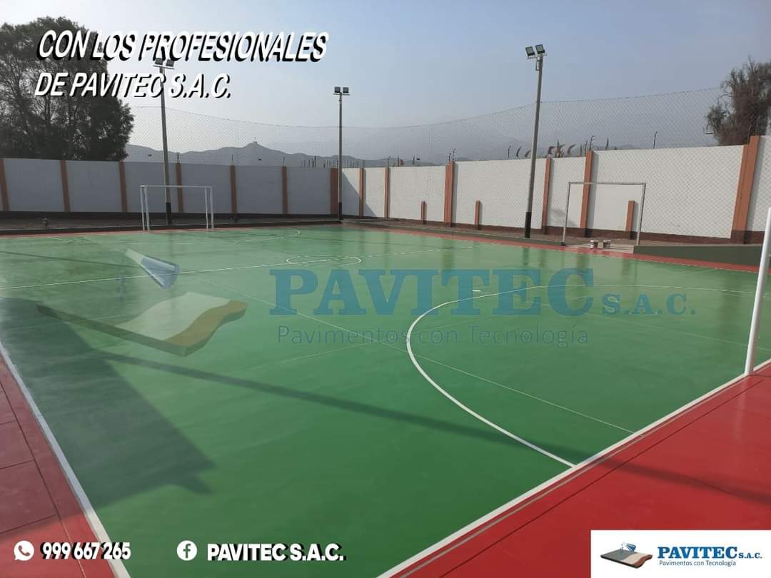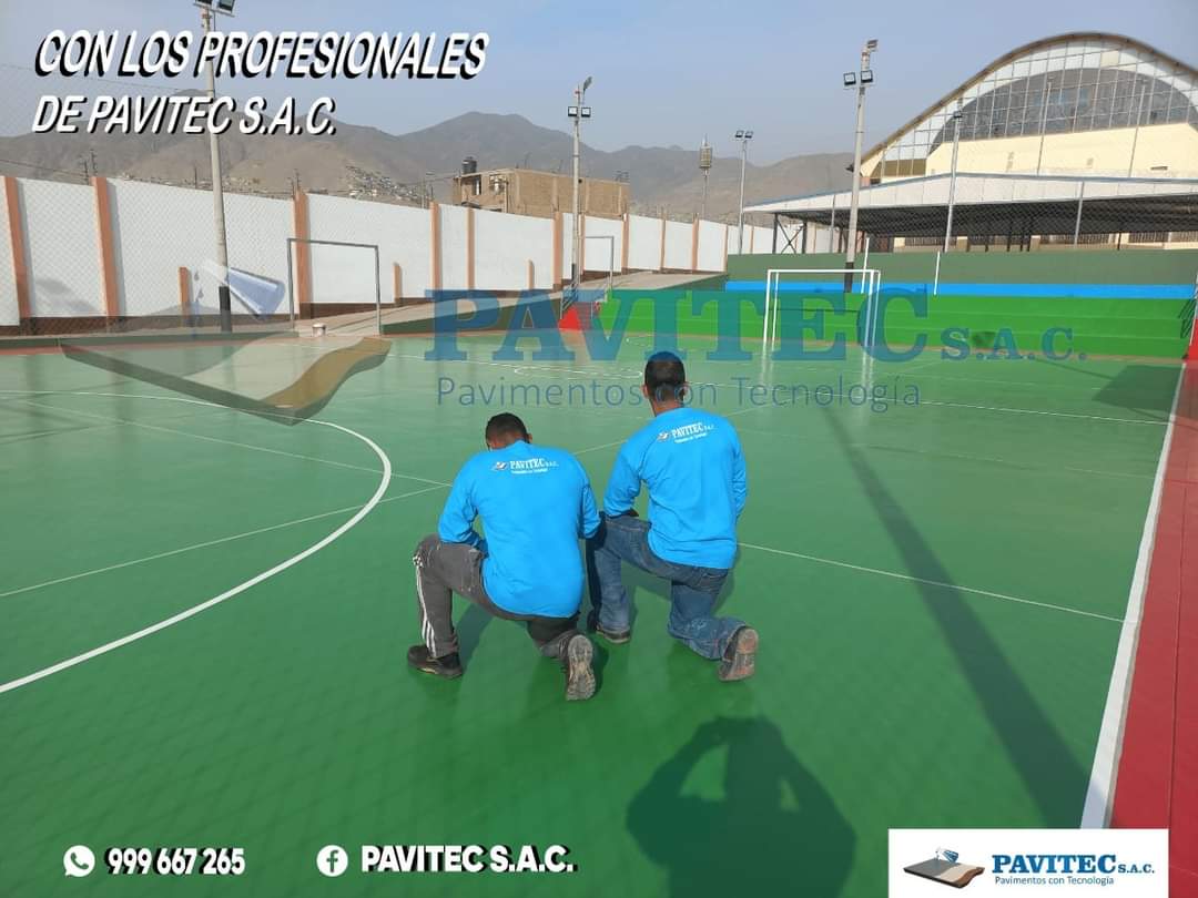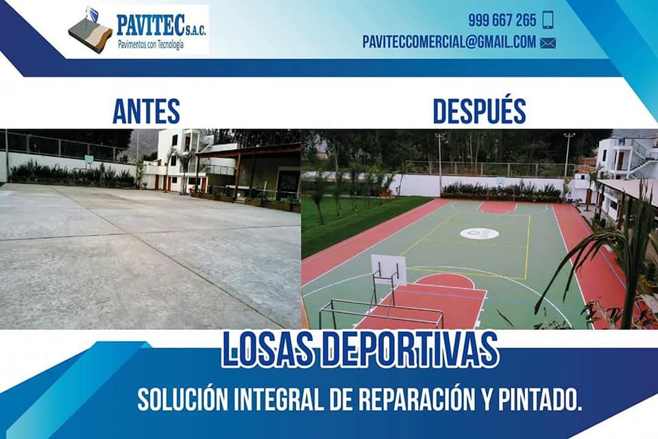 PAVITEC S.A.C (PAVIMENTOS CON TECNOLOGÍA), empresa especializada en reparaciones y pintado de losas deportivas con materiales de última tecnología (importados), pintura acrílica, resistente al impacto, antideslizante, resistente a los rayos UV de muy buen anclaje, 100% lavable, realizamos trabajos especiales desde, un proyecto de losa de concreto, pisos industriales, almacenes y cualquier proyecto de ingeniería civil.