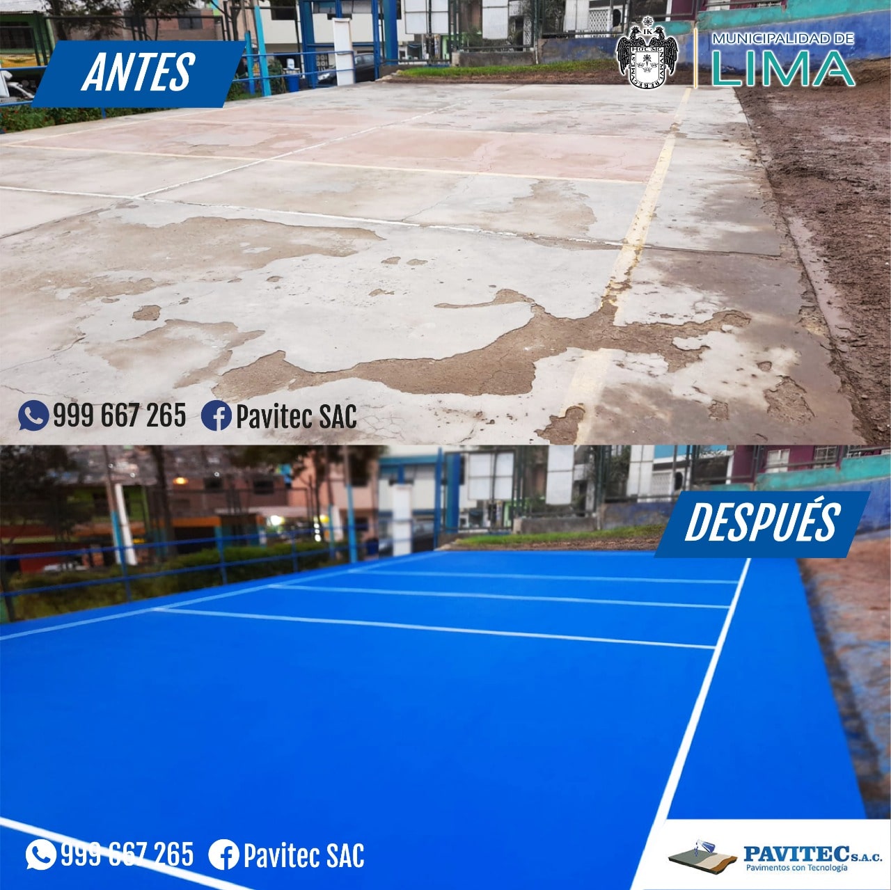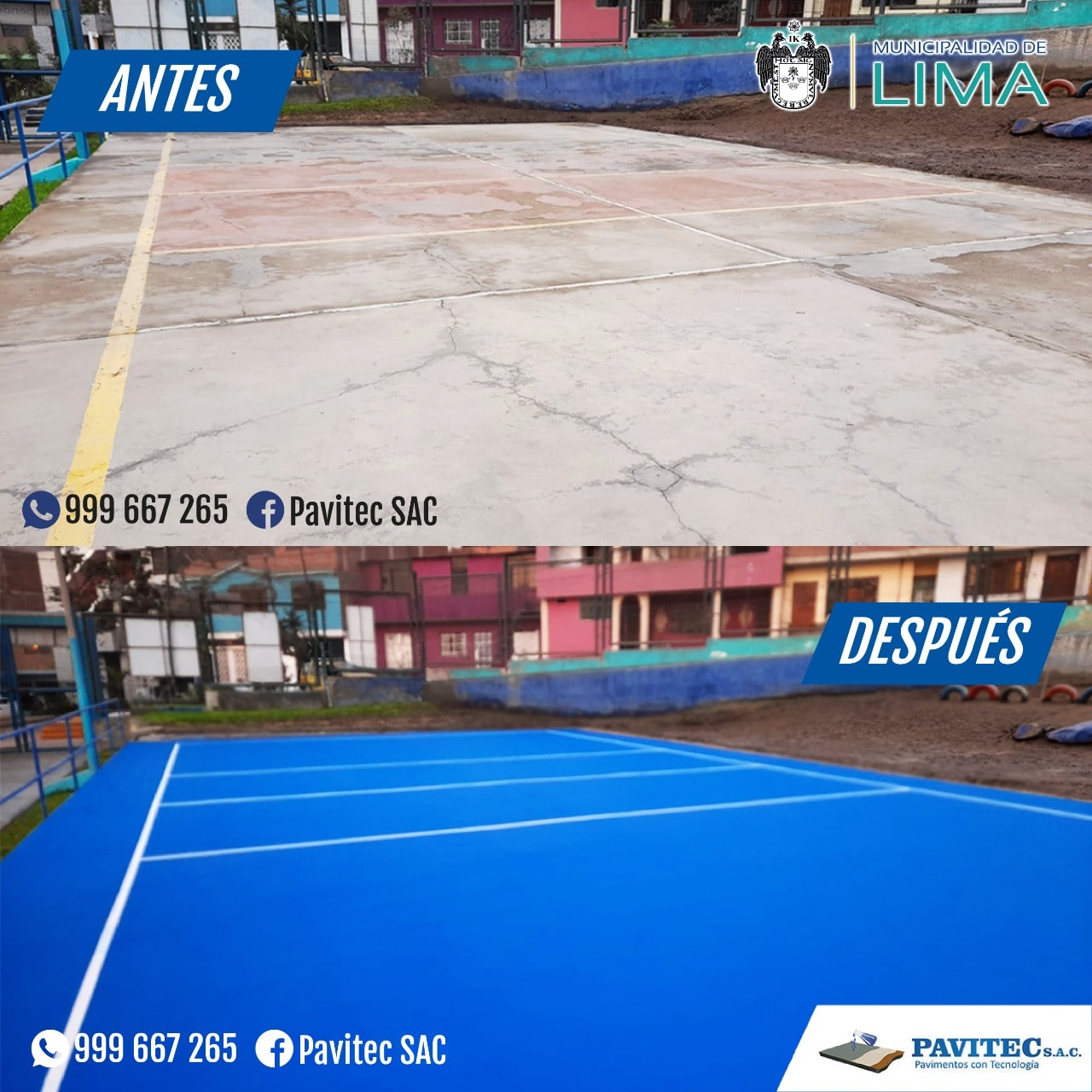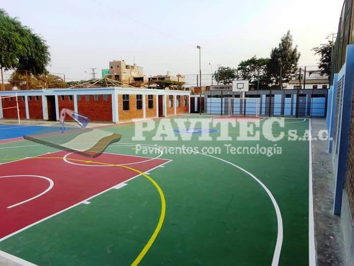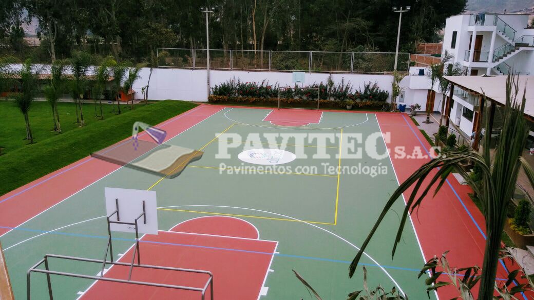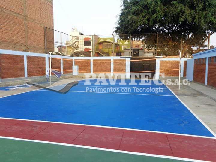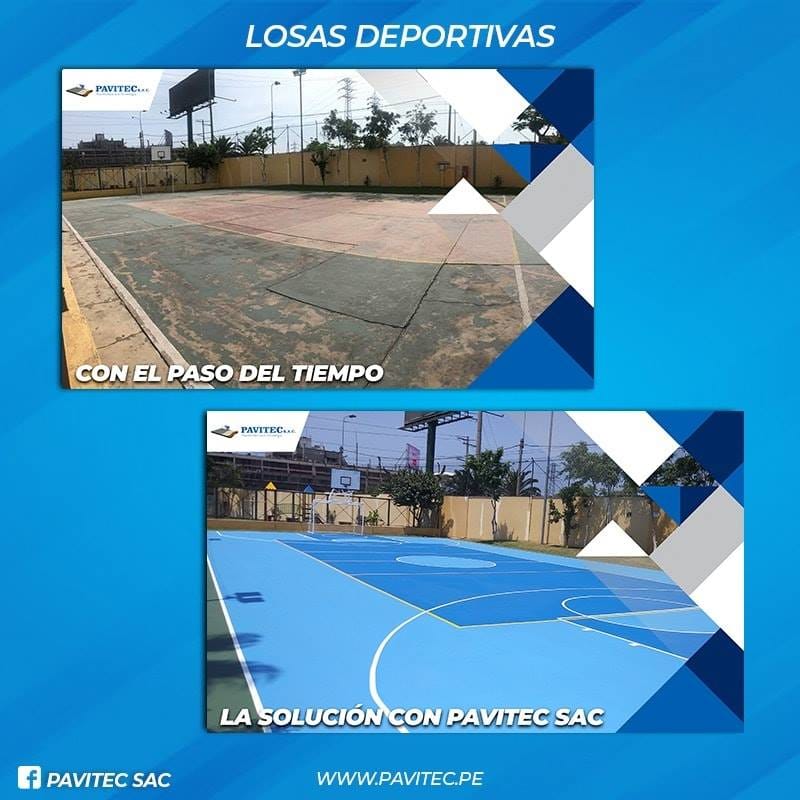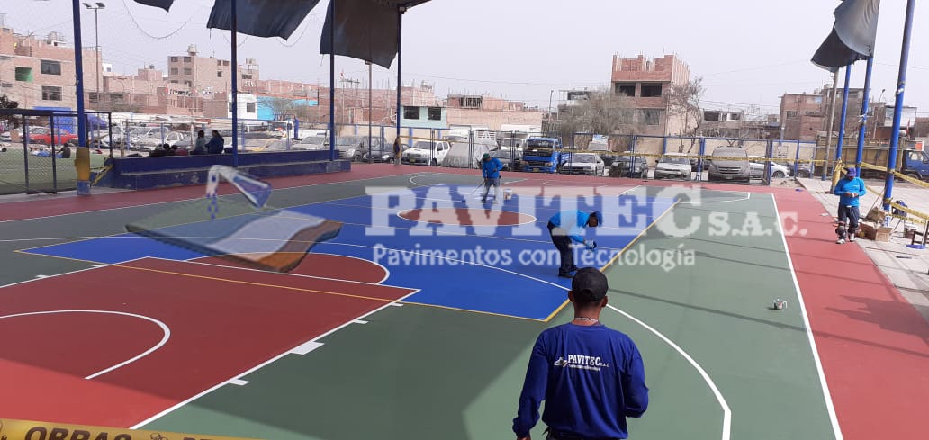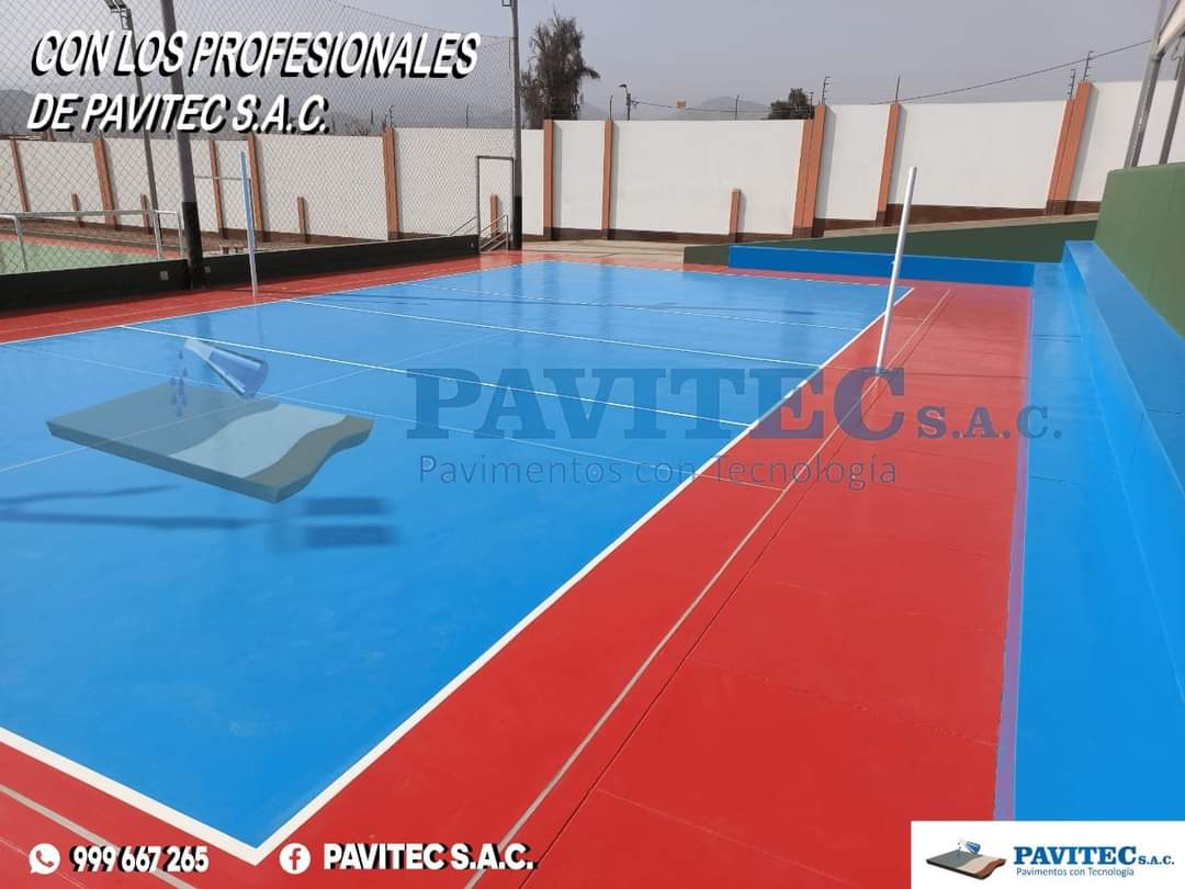 PAVITEC S.A.C (PAVIMENTOS CON TECNOLOGÍA), empresa especializada en reparaciones y pintado de losas deportivas con materiales de última tecnología (importados), pintura acrílica, resistente al impacto, antideslizante, resistente a los rayos UV de muy buen anclaje, 100% lavable, realizamos trabajos especiales desde, un proyecto de losa de concreto, pisos industriales, almacenes y cualquier proyecto de ingeniería civil.